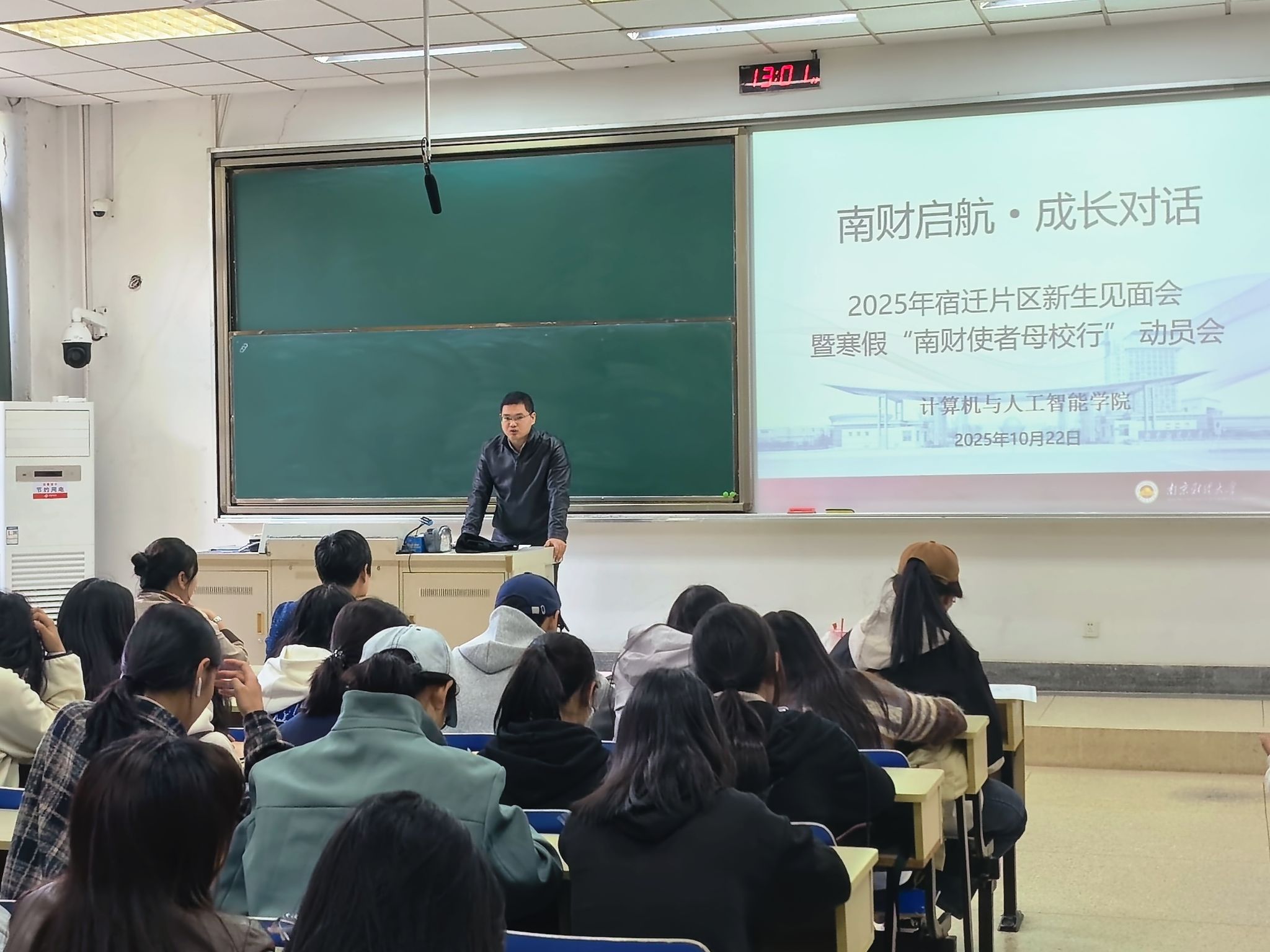 宿迁籍老生代表大数据2401刘力畅与大家进行了亲切交流。他回顾了自己在校一年时间的成长与变化,鼓励新生们将家乡的优良品格带入校园,积极适应新环境,同时欢迎同学们随时为学校的招生宣传工作建言献策。
